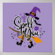 his enchanting Halloween-themed artwork features the playful phrase "I Put a Spell on You" in a whimsical, curly font that adds a magical touch. The design is brought to life with vibrant illustrations of classic witchy elements, including a pointed purple witch's hat, a broomstick, and striped stockings paired with curled-toe shoes. Surrounding the text are charming details like a potion bottle, bats, and sparkling stars, all rendered in a colour palette of deep purples, oranges, and blacks, perfectly capturing the spooky yet fun spirit of Halloween. This design is ideal for festive decor, apparel, or holiday cards, adding a touch of witchy charm to any Halloween celebration.