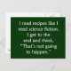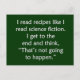 Celebrate your lack of cooking skills! Reads "I read recipes like I read science fiction. I get to the end and think, "That's not going to happen." Available in green, red or white print.