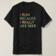 I run because I really like beer saying. In large all caps brown/beige and green/teal fonts/letters. Funny gear for working out and keeping fit.