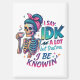 Vibrant, colourful design featuring a female skeleton sipping coffee. The colourful text reads: "I say IDK a lot but trust me, I be knowin". This design is available on a wide variety of products.