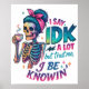 Vibrant, colourful design featuring a female skeleton sipping coffee. The colourful text reads: "I say IDK a lot but trust me, I be knowin". This design is available on a wide variety of products.