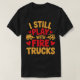 This black t-shirt features the text "I STILL PLAY" stacked at the top in a yellow, slightly rounded font. The word "with" is in a smaller yellow font between "PLAY" and "FIRE," which is displayed in a bold red font. Below "FIRE," "TRUCKS" is written in the same yellow font as the top text. Small red hearts and cartoon fire truck graphics accent the design. This playful shirt suggests a continued fondness for fire trucks.