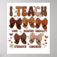 The image contains the text "I TEACH" at the top, with each letter in a different shade of brown. There are two daisies and several heart shapes around the text. Below the text, there are six bows, each in different shades of brown, with a heart in the centre of each bow. Each bow is labelled with a word underneath it.