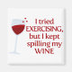 This funny magnet features a clipart graphic of a tipped wine glass with splashes of wine coming out to the left of text that says, "I tried EXERCISING, but I kept spilling my WINE".