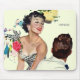 Artist:Joe DeMers | Woman in a zebra striped dress and red flower pin leaning over in a chair talking to a man in a white suit