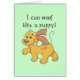 A happy looking brown dog with black kid style text that reads "I can woof like a puppy!" on puppy dog T-shirts, tote bags, stickers, mugs, and more.