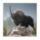 A woolly rhino stands atop some snow covered rocks in a wintry ice age scene. The dark fur covered beast is a massive creature with a great curved horn and a strong build. With steamy breath the mighty rhinoceros surveys the land around him. Behind him a forest of conifers fades into the distance. The ground is covered with snow, but a few brown blades of grass and weeds poke through as well as the occasional short squat pine tree.