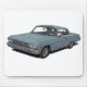 Digitally enhanced image of an ice blue image of a 1962 Impala Coupe with driver throwing peace sign.
