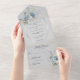 This All-in-One wedding invitation offers the combination of the soft grey background with the striking ice blue bohemian flower bouquets, creating a harmonious and sophisticated look that perfectly reflects the beauty of your love story. The All-in-One wedding invitations are both beautiful and practical by combining the wedding invitation with an easy to remove perforated RSVP postcard. They are also quick and easy to prepare for mailing. Simply address the invitation, fold the back flap and seal with the included clear stickers. Once your guests receive the pre-addressed invitation they simply tear off the perforated RSVP card and drop it in the mail.