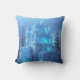Throw pillow of a magical castle made entirely of ice. A frozen waterfall descends from the keep's foundations to become icicles at its end. Pine trees flank the castle as the Sun refracts through the ice creating beautiful blue lights that seem to come from the heart of the keep... maybe the frozen dreams trying to break free. The image was generated with Leonardo.ai and altered by me.