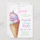 Cute and colourful two scoops of fun birthday party invitation for girl. This is vibrant with purple and pink with ice cream cone number 2 with lots of sprinkles.