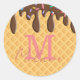 These custom sticker labels feature a yummy looking ice cream cone design. The background is waffle cone pattern. Brown chocolate frosting drips with rainbow sprinkles is dripping from the top. A sample initial and name are printed below the icing which you can personalise to include your own name, or other custom text.