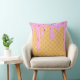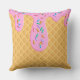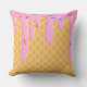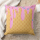 This custom throw pillow features a yummy looking ice cream cone design. The background is waffle cone pattern. Strawberry pink frosting drips with rainbow sprinkles is dripping from the top.