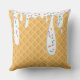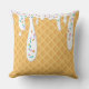 This custom throw pillow features a yummy looking ice cream cone design. The background is waffle cone pattern. White vanilla frosting drips with rainbow sprinkles is dripping from the top.