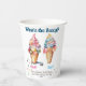 Cute and modern and trendy gender reveal party cup  featuring a watercolor illustration of ice cream in waffle cones in pink and blue with gold icecream splash. The text says "What's the scoop? Boy or Girl?" Perfect for a gender reveal party in the summer.