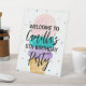 It is sturdy than I expected. Was worried about the material being flimsy but it is not. It is printed on some sort of plastic material. It should serve well at our wedding as long as wind isn’t too bad. Otherwise we will put some paper weights behind it and should be fine.