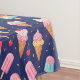 Pattern on blue background with creamy ice cream and popsicles, cherries and confetti floating around. Cute whimsical food design.