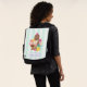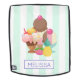 A personalised backpack illustrated with a bowl of ice cream with 3 delicious scoops covered in candy sprinkles. An ice cream cone also with 3 scoops of chocolate, vanilla and strawberry. A dessert bowl filled with neopolitan flavoued ice cream with a delicious cherry on top. A green and white stripes pattern in the background.