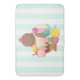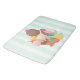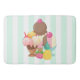 A bath mat illustrated with a bowl of ice cream with 3 delicious scoops covered in candy sprinkles. An ice cream cone also with 3 scoops of chocolate, vanilla and strawberry. A dessert bowl filled with neopolitan flavoued ice cream with a delicious cherry on top. A green and white stripes pattern in the background.