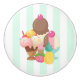 A ceramic knob illustrated with a bowl of ice cream with 3 delicious scoops covered in candy sprinkles. An ice cream cone also with 3 scoops of chocolate, vanilla and strawberry. A dessert bowl filled with neopolitan flavoued ice cream with a delicious cherry on top. A green and white stripes pattern in the background.