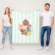 A fleece blanket illustrated with a bowl of ice cream with 3 delicious scoops covered in candy sprinkles. An ice cream cone also with 3 scoops of chocolate, vanilla and strawberry. A dessert bowl filled with neopolitan flavoued ice cream with a delicious cherry on top. A green and white stripes pattern in the background.