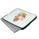 Laptop sleeve illustrated with drawing of a 3 scoop ice cream sundae with colourful sprinkles. An ice cream cone with scoops of chocolate, strawberry and vanilla. A bowl of neopolitan ice cream with a cherry on top. Strawberries and a pineapple fruit sit beside the bowls. Summery and sweet. A mint green and white stripes pattern in the background.