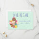 Save the date flat card illustrated with drawing of a 3 scoop ice cream sundae with colourful sprinkles. An ice cream cone with scoops of chocolate, strawberry and vanilla. A bowl of neopolitan ice cream with a cherry on top. Strawberries and a pineapple fruit sit beside the bowls. Summery and sweet.