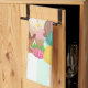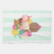 A kitchen towel illustrated with a bowl of ice cream with 3 delicious scoops covered in candy sprinkles. An ice cream cone also with 3 scoops of chocolate, vanilla and strawberry. A dessert bowl filled with neopolitan flavoued ice cream with a delicious cherry on top. A green and white stripes pattern in the background.