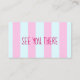 Cute, hand-drawn illustration of a strawberry vanilla ice cream cup with chocolate sticks and surrounded by strawberries in a white circle. Background is a fresh mint blue. Your shop name is written in a trendy, handscript pink typography. Your dates are written in a matching simple typography. Backside shows stripes in pink and blue. You have the possibility to write a note for your customers.