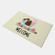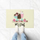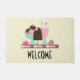 A welcome doormat with a sweet ice cream theme. Illustrated with a chocolate ice cream bar, 3-scoop sundae with a cherry on top, and a strawberry float with whipped cream. Little strawberries and cherries. Pale yellow background. Refreshing, hot summer treats.