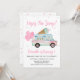 Cute pink and mint coloured ice cream van birthday invitation for a little girl featuring a van, ice-cream cones and lots of heat shaped pink balloons.