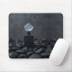 A sleek, minimalist photorealistic composition featuring an unbranded matte black rectangular perfume bottle with sharply defined edges, resting delicately on a bed of highly polished jet-black river stones. A single, perfectly formed abstract ice crystal with intricate, sharp facets is carefully balanced atop the bottle's flat surface. Subtle condensation dots the cool stone and the lower section of the bottle, enhancing the fresh, icy feel. Stark, cool, directional lighting creates deep shadows and emphasizes the contrasting textures of the matte bottle, glossy stones, and crystaline ice, all set against a dark, subtly textured concrete background.