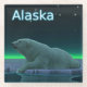A peaceful moment in the long Arctic night. A Polar Bear rests at the edge of an open area in the pack ice. The Northern Lights glow in the distance; bright stars twinkle overhead. Text reading "Alaska" appears in glowing blue and white. Polar bears are endangered. How much longer will scenes like this be able to occur? Please help save Polar Bears from extinction.