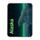 A peaceful moment in the long Arctic night. A Polar Bear rests at the edge of an open area in the pack ice.The Northern Lights glow in the distance; bright stars twinkle overhead. Text reading "Alaska" appears in glowing green and white. Polar bears are endangered. How much longer will scenes like this be able to occur? Please help save Polar Bears from extinction.