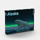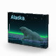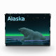 A peaceful moment in the long Arctic night. A Polar Bear rests at the edge of an open area in the pack ice.The Northern Lights glow in the distance; bright stars twinkle overhead. Text reading "Alaska" appears in glowing blue and white. Polar bears are endangered. How much longer will scenes like this be able to occur? Please help save Polar Bears from extinction.