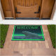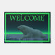 A peaceful moment in the long Arctic night. A Polar Bear rests at the edge of an open area in the pack ice. The Northern Lights glow in the distance; bright stars twinkle overhead. Text reading, "WELCOME" also appears.