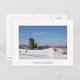 Postcard with people ice skating on the frozen river along several windmills on a beautiful winter day in Kinderdijk, the Netherlands with a white border and the text 'Holland'.