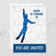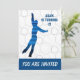 Modern ice skating birthday party invitation with silhouette of boy figure skater and stars (blue and grey).