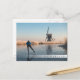 Postcard of an athlete ice skating on a frozen river past hoar-frosted reeds and a windmill on a beautiful winter morning in the Netherlands with a fading white bar and the text: 'Netherlands'.
