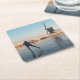Coaster with an athlete ice skating on a frozen river past hoar-frosted reeds and a windmill on a beautiful winter morning in the Netherlands.