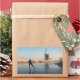 Rectangular photo sticker of an athlete ice skating on a frozen river past hoar-frosted reeds and a windmill on a beautiful winter morning in the Netherlands.