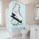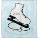 A white ice skate on a blue and white background with an area you can personalise with a name before ordering, or leave blank for an non-personalised shower curtain.