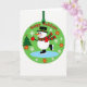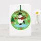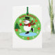 Spread holiday cheer with this festive and heartwarming Christmas card! 🎅🏼🎄🎁 Imagine receiving a round, lime green ornament adorned with a cheerful snowman ice skating on a light blue rink. The snowman sports a black top hat, a red and green striped scarf, and mittens, all while flashing a bright smile. This adorable scene is set against a backdrop of white snowflakes, red stars, and a small Christmas tree. The words "Happy Holidays" in red and green lettering tie everything together. Perfect for adding a touch of joy to any family Christmas tree or gift tag, this card is sure to bring smiles all around!