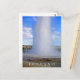 A beautiful view of a geyser shooting water in Iceland printed on a postcard.