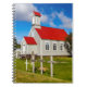 Traditional Icelandic church with a red roof and surrounded by lawn, some trees and a few crosses.