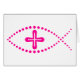 A dotty decorative version of the Ichthus in pink, the Christian fish symbol.