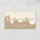 A cute and colourful business card, perfect for a bakery, caterer, or individual selling homemade cakes, cupcakes, sweets and other treats. The front of the card reads your name in white text, followed by sweet treats. Pastel coloured yellow, green, blue and pink text reads Tastes so good, on a background of cream dripping icing with cake sprinkles. Personalise by adding your business and contact details to the back.