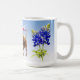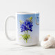 Unique mug design featuring the Bluebonnet flowers of Texas and a Texas Longhorn on light blue. The Bluebonnet flower is the state flower of Texas. In March and April, these beautiful flowers bloom in fields and freeway medians.