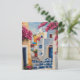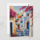 Iconic views of Oia, including narrow cobblestone steps and cascading bougainvillea flowers.