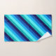 A set of bath towels featuring a cool pattern design of diagonal stripes in navy blue, cobalt blue, sky blue, icy mint teal, and light turquoise.